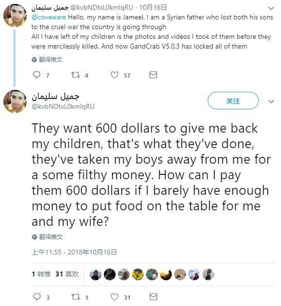 2018年10月16日,一位名叫Jameel的叙利亚父亲在Twitter上发帖求助,说自己的电脑感染了GandCrab V5.0.3并遭到加密,由于无力支付高达600美元的“赎金”,他再也无法看到在战争中丧生的小儿子的照片。