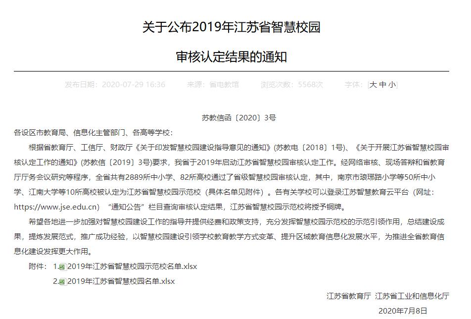 近日,江苏省教育厅、江苏省工业和信息化厅公布了2019年江苏省智慧校园审核认定结果,我校顺利通过审核认定,成为江苏省首批高校智慧校园。